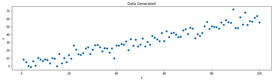 To generate some data, we let x be a series from 1 to 100 with steps of 1 and where