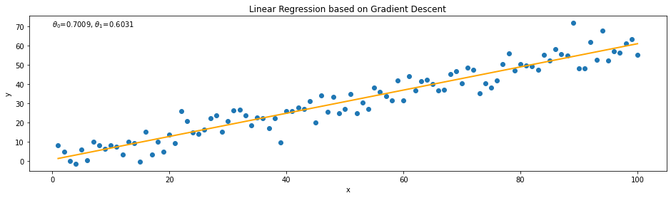plt.text(x=0, y=70, s=r"$\theta_0$={}, $\theta_1$={}".format(np.round(coef_[0],4),np.round(coef_[1],4)))