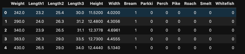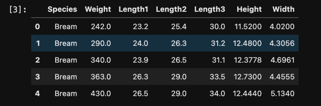 The dataset that we will be using for multivariate linear regression is the fish market data from Kaggle.com. The dataset contains 159 observations with 7 features.